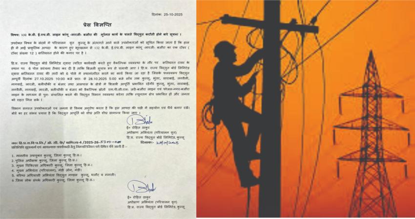 परिचालन वृत कुल्लू के अधीक्षण अभियंता रोहित ठाकुर ने बताया कि इस लाइन पर एक टावर क्षतिग्रस्त होने की कगार पर है। वैकल्पिक व्यवस्था के तौर पर क्षतिग्रस्त टावर के स्थान पर 6 पोल की संरचना तैयार की गई है। क्षतिग्रस्त टावर से तारों को छह पोलों पर स्थानांतरित करने के कार्य के चलते कुल्लू, भुंतर, शाढ़ाबाई, लगवैली, नगवाईं, लारजी, बालीचौकी व बंजार सहित आसपास के क्षेत्रों में दो दिन बिजली बाधित रहेगी। उन्होंने बताया कि एमपीसीएल जरी-बजौरा, एवं फोजल- नगर- बजौरा लाइन के माध्यम से पुनः संचालित करने की विद्युत विभाग व्यवस्था करेगा, ताकि कम से कम क्षेत्र प्रभावित हों। उन्होंने आपदा के इस समय में लोगों से संयम रखने और सहयोग की अपील की।