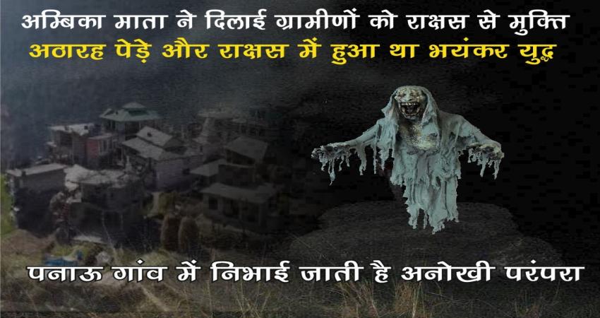 मंडी। यह कहानी है मंडी जिला की ग्राम पंचायत नाऊ के पनाऊ गांव की जहां प्राचीन समय में गांव के लोग जब खेतों में जब काम करने जाते थे तो उनको राक्षस की झपट लग जाती थी। जिससे ग्रामीणों का खेतों में काम करना मुश्किल हो गया। राक्षस से परेशान लोग क्षेत्र की अधिष्ठात्री भगवती माता अम्बिका नाऊ के दरवार पहुंचे तथा राक्षस से रक्षा करने की माता से प्रार्थना कीे। माता अम्बिका ने अठारह पेड़े जो माता के प्रौल के प्रहरी माने जाते है, उनको राक्षस से रक्षा करने के लिए भेजा। अठारह पेड़े और राक्षस में भयंकर युद्ध हुआ और माता की कृपा से राक्षस को एक बड़ी चट्टान के नीचे दबा दिया।
