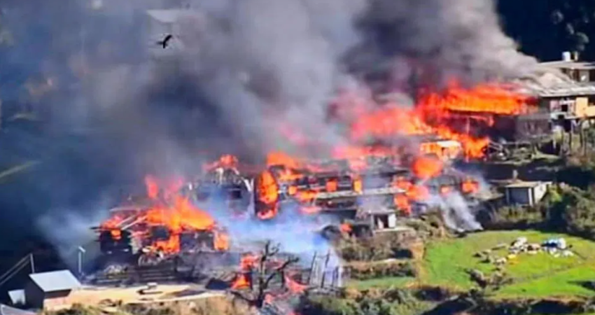 कुल्लू। जिला की बंजार घाटी की नोहांडा पंचायत के झनियार गांव में भीषण अग्निकांड हुआ सोमवार दोपहर करीब 1ः30 लगी आग से पूरा गांव इसकी चपेट में आ गया है। इसमें करीब 16 घर और चार गोशालाएं जलकर राख हो गई हैं। इसके अलावा देवता देवता वीमू नाग व जोगनी माता के दो मंदिर में भी जलकर राख हुए। वहीं एक बछड़ा भी जिंदा जल गया है।