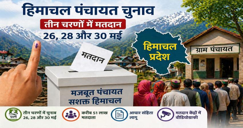 शिमला। हिमाचल प्रदेश पंचायत चुनाव का आज ऐलान हो गया है। राज्य निर्वाचन आयोग ने दोपहर बाद 3 बजकर 40 मिनट पर प्रेस वार्ता में ये जानकारी दी। हिमाचल प्रदेश राज्य निर्वाचन आयुक्त अनिल खाची पत्रकार वार्ता को संबोधित करते हुए ये ऐलान किया। इसके साथ ही आचार संहिता लग गई है। आचार संहिता में सरकारी मिशनरियों का इस्तेमाल नहीं होगा। दो स्तर पर मतों की गणना होगी। प्रधान, उपप्रधान, सदस्य की गणना के बाद परिणाम आएंगे। मतदान केंद्रों में वीडियोग्राफी होगी। हिमाचल में पहला चरण 26 मई को है वहीं, दूसरा चरण 28 मई को होगा।