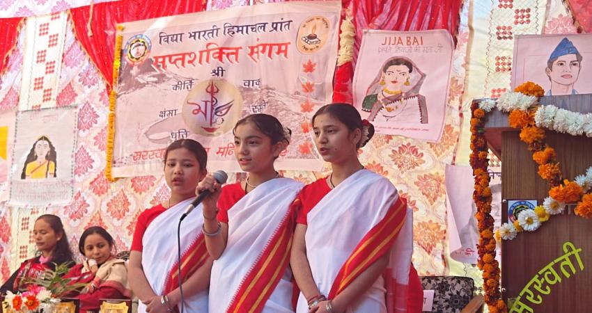 कार्यक्रम की अध्यक्षता नाऊ गांव की गिन्दू देवी ने की। गिन्दू देवी नाऊ गांव के सबसे बड़े संयुक्त परिवार की मुखिया हैं। उनके परिवार में 31 सदस्य हैं। कार्यक्रम में मुख्य वक्ता भानू कपूर ने भारत के विकास में महिलाओं की भूमिका पर अपने विचार रखें। सह वक्ता रेणुका ठाकुर ने कुटुम्ब प्रबाेधन एवं पर्यावरण के संबंध में भारतीय दृष्टि विषय पर सभी को संबोधित किया। कार्यक्रम की संयोजिका उषा पठानिया ने सप्तशक्ति के बारे में विस्तार से जानकारी दी। विद्यालय की प्रधानाचार्या गीता ठाकुर ने बताया कि कार्यक्रम का शुभारंभ दीप प्रज्जवलन से हुआ। संगम में अशमिता ने महिषासुर मर्दिनी स्त्रोत सुनाया। प्रियांशी, मायरा और तिक्षिता ने मधुराष्टकम सुनाया। समारोह में प्रश्नोतरी का भी आयोजन किया गया। इस दौरान उतर देने वालों को पुरस्कृत किया गया। कार्यक्रम में विशिष्ठ माताओं को सम्मानित किया गया। इस दौरान सभी प्रतिभागियों ने अपने अनुभव सांझा किए। कार्यक्रम में विभिन्न महिला मंडलों की महिलाओं में भजन प्रतिस्पर्धा भी करवाई गई। कार्यक्रम में स्कूल की दीदीओं ने महान हस्तियों की झांकियां निकाली।