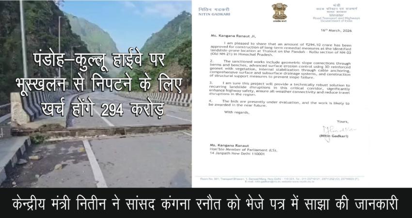 यह जानकारी केंद्रीय मंत्री ने सांसद Kangana Ranaut को भेजे पत्र में साझा की है। उन्होंने बताया कि यह परियोजना लंबे समय से भूस्खलन की समस्या से जूझ रहे इस अहम मार्ग को सुरक्षित और सुगम बनाने में कारगर साबित होगी।