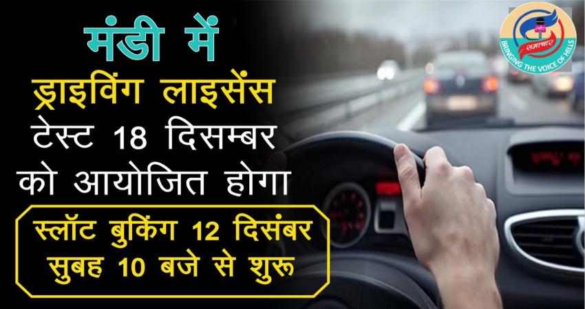 मंडी, 5 दिसम्बर। सदर उपमण्डल में ड्राइविंग लाइसेंस टेस्ट 18 दिसम्बर को छोटा पड्डल स्थित बैडमिंटन कोर्ट के सामने वाली सड़क पर आयोजित किया जाएगा। यह जानकारी एसडीएम सदर मंडी रुपिंदर कौर ने दी। एसडीएम ने बताया कि ड्राइविंग लाइसेंस टेस्ट में भाग लेने वाले अभ्यर्थी अपना फॉर्म फोटो सहित पूर्ण रूप से भरकर तथा निर्धारित फाइल सहित लेकर उपस्थित हों। बिना फोटो, बिना फाइल और अधूरे भरे फॉर्म किसी भी स्थिति में स्वीकार नहीं किए जाएंगे। उन्होंने बताया कि टेस्ट के लिए स्लॉट बुकिंग 12 दिसम्बर को प्रातः 10 बजे से Parivahan.gov.in के माध्यम से ऑनलाइन की जा सकेगी।