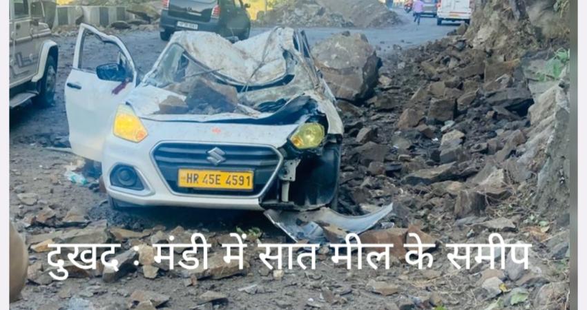 मंडी। चंडीगढ़-मनाली नेशनल हाईवे पर चार मील के पास एक दर्दनाक हादसा हुआ, जिसमें चलती टैक्सी पर पत्थर गिरने से मुंबई से आई एक महिला की मौत हो गई। यह मनाली से वापिस मुंबई लौट रहे थे। हादसे में महिला की मौके पर ही मौत हो गई, जबकि टैक्सी चालक और पति घायल हो गए। हादसा उस समय हुआ जब टैक्सी पहाड़ी क्षेत्र से गुजर रही थी और अचानक ऊपर से एक बड़े पत्थर टैक्सी पर आ गिरे। पुलिस ने घटना की जानकारी मिलते ही घायलों को अस्पताल पहुंचाया और मामले की जांच शुरू कर दी है।जा