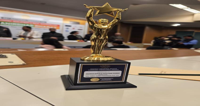 इंटरनेशनल अचीवर्स कॉन्फ्रेंस द्वारा आयोजित एक समारोह में Hill Thrill Agro Processor Pvt. Ltd. को "Fastest Growing Indian Company Excellence Award" से सम्मानित किया गया। यह सम्मान कंपनी के निदेशक रविंदर कुमार और खीरा मणि शर्मा को प्रदान किया गया। सम्मान समारोह में विभिन्न क्षेत्रों में उत्कृष्ट प्रदर्शन करने वाले उद्यमियों और संस्थानों को पुरस्कृत किया गया। Hill Thrill Agro Processor Pvt. Ltd. को यह पुरस्कार कृषि प्रसंस्करण क्षेत्र में बेहतर कार्य, नवाचार और तेज़ी से विकास के लिए दिया गया। पुरस्कार ग्रहण करते हुए निदेशकों ने कहा कि यह सम्मान उनकी टीम की मेहनत और ग्राहकों के विश्वास का परिणाम है। उन्होंने भविष्य में भी प्रदेश और देश के किसानों को लाभ पहुंचाने तथा क्षेत्र में रोजगार सृजन करने की दिशा में निरंतर कार्य करने की बात कही। कार्यक्रम में उद्योग जगत के प्रतिनिधियों, अधिकारियों और विभिन्न राज्यों से आए प्रतिभागियों ने भाग लिया। कम्पनी के चेयरमैन भगीरथ चौहान ने कम्पनी की एंटायर टीम को बधाई दी है। उन्होंने कहा कि भविष्य में वे इस दिशा में और बेहतर करने का प्रयास करेंगे।