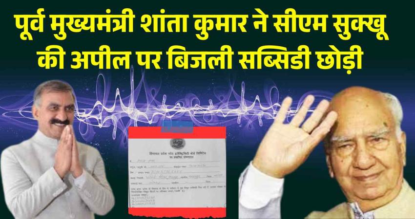 भाजपा के वरिष्ठ नेता और पूर्व मुख्यमंत्री शांता कुमार ने मुख्यमंत्री सुखविंद्र सिंह सुक्खू की अपील पर अपनी बिजली सब्सिडी छोड़ने का निर्णय लिया है। मुख्यमंत्री ने प्रदेश के आर्थिक सुधार के लिए साधन संपन्न लोगों से बिजली सब्सिडी त्यागने की अपील की थी, जिसका समर्थन करते हुए शांता कुमार ने यह कदम उठाया।