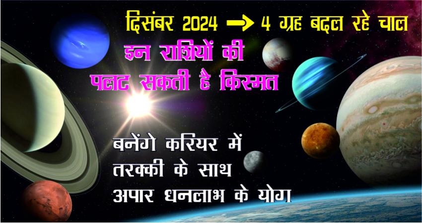 दिसंबर महीने में कई ग्रह अपनी चाल बदलने जा रहे हैं। इस महीने मंगल व सूर्य समेत 4 ग्रहों की चाल में बदलाव देखने को मिलेगा। आपको बता दें कि साल के आखिरी महीने में सबसे पहले 2 दिसंबर को शुक्र मकर राशि में प्रवेश करेंगे तथा उसके बाद 7 दिसंबर को मंगल कर्क राशि में वक्री हो जाएंगे, वहीं 15 दिसंबर को सूर्य धनु राशि में प्रवेश करेंगे। इसके अलावा अगले ही दिन बुध वृश्चिक राशि में फिर से मार्गी हो जाएंगे। सबसे आखिर में शुक्र 28 दिसंबर को शनि की राशि कुंभ में गोचर करेंगे। ऐसे में इन ग्रहों की चाल में बदलाव कुछ राशियों के लिए लाभदायक सिद्व हो सकता है व करियर और कारोबार में तरक्की मिल सकती है। आइए जानते हैं ये राशियां कौन-कौन सी ह ..........