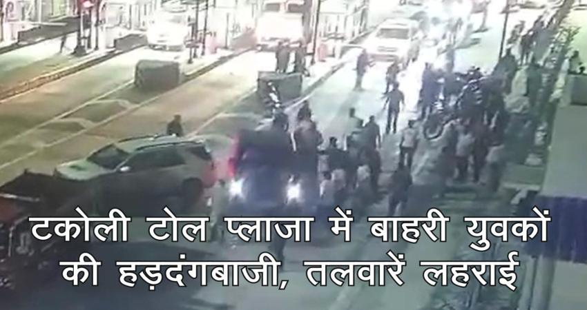 टकोली। कीरतपुर मनाली फोरलेन पर टकोली टोल प्लाजा में बाहरी युवकों के द्वारा रविवार देर शाम हुड़दंग मचाने और तलवारें लहराने का मामला सामने आया है। बताया जा रहा है कि थार में सवार इन युवकों ने टोल नहीं देने को लेकर टोल प्लाजा स्टाफ से बहसबाजी करने लगे इस बीच वहां लोगों की भीड़ इक्टठा हो गई। जिसके बाद बाहरी युवकों द्वारा तलवार लहरानें की बात सामने आ रही है। हादसे की जानकारी मिलते ही औट पुलिस का दल थाना प्रभारी करण सिंह की अगुआई में मौके पर पहुंच तुरंत कार्यबाही में जुट गया। पुलिस ने 126,2/115,2/118,1/191,2/190,352 बीएनएस तथा 25,54,59 आर्म्स एक्ट के तहत मामला दर्ज कर छानबिन शुरू की गई है। स्थानीय पंचायत के प्रधान सुन्दर ठाकुर ने बताया कि रविवार रात्रि साढे आठ बजे के करीब टकोली टोल पर यह घटना हुई तथा तुरंत औट थाना पुलिस को सूचना दी गई। पंचायत प्रधान ने बताया कि तलबार बाजी में किन्नारे खड़ा स्थानीय ग्रामीण विपन कुमार चपेट में आ गया। विपन के सिर व आंख में चोट आई है। स्थानीय पंचायत प्रधान ने बताया कि उक्त हुडदंगीयों ने भागने व खड़ी भीड़ पर गाडी चढ़ाने का प्रयास भी किया।